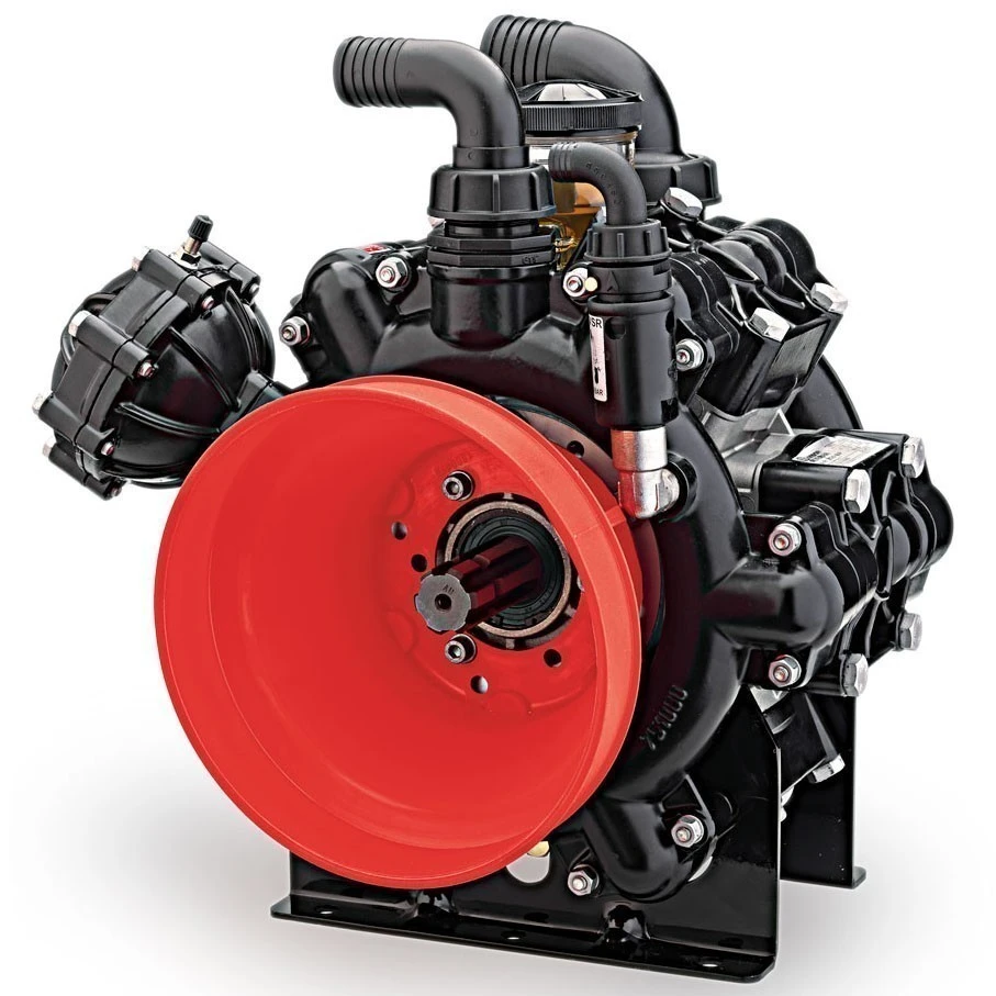 - Semi-hydraulic six-diaphragm pump, for use in low pressure systems. Parts in contact with pumped liquids in plastic-coated aluminium Rilsan and AISI 303/304. Diaphragms in NBR. Seals in NBR. Die-cast casing with oil-immersed mechanism and clear plastic tank for visual level checking. Fitted with air-hydraulic damper for smoother operation and less hammer effect in the delivery circuit. Remote level monitoring sensor on request. Remote oil tank installation kit available on request. Oil drainage stopper. Pistons with ring for a more efficient “oil cushion” system to protect the diaphragm. Spherical sector profile valves for lower flow resistance and improved volumetric efficiency. Rugged feet secured to pump casing. Mass-produced safety valve and cardan protection. Geomet metal fasteners. Available pulley fixtures, flanges for hydraulic motors and hydraulic pumps for overgears. Kit for combining two pumps to form a modular unit to supply the sprayer’s various uses.